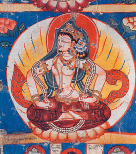 6] In the Mahavairocana sutra Vairocana is associated with the lion as his vahana, "vehicle" or "mount", to signify his conflation with Shakyamuni, the historic Buddha, and he is the central figure between Avalokiteshvara of the lotus family and Vajrapani of the vajra family. In later esoteric Buddhist texts which gained great popularity in the Guge kingdom during the 11th century revival of Buddhist teachings promoted by Yeshe Od, Vairocana Buddha, literally the "Resplendent" one is the Buddha who is positioned as the central Buddha of the Five Buddha families. [
