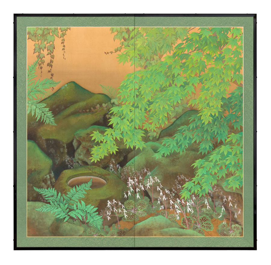 Garden Scene 1930s, Japan 60¼ x 61¾ in. (153 x 157 cm) Two-panel folding screen; ink, mineral colors, and shell powder on sil
