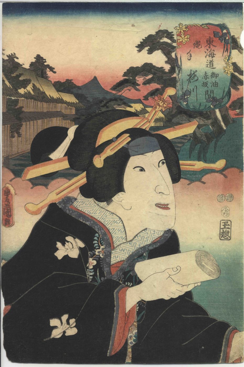 I need a little help with a Japanese woodblock print by Utagawa Kunisada, printed in 1857. I can't find it with an image search. I think it is a genji print because of the symbols on the cloth at the center of the diptych. However, I can't match the symbol to any of the genji-mon in the 3rd picture. (Do some of the chapters of the Genji have an alternative genji-mon?