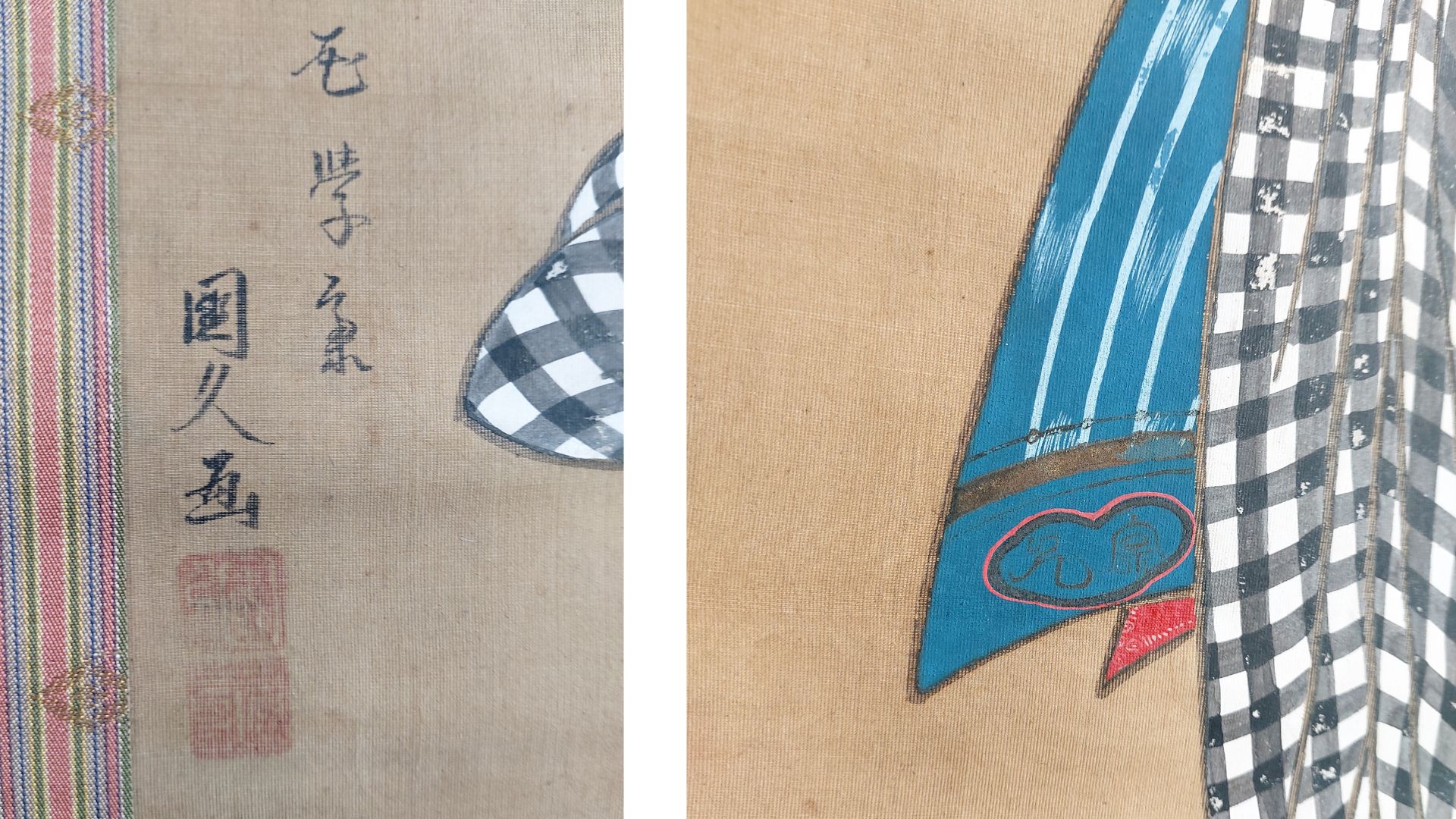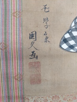 The painting came in a box containing an invoice, a 1967 Japanese newspaper, and a handwritten biography of Kunihisa I, suggesting it was misattributed to him. A Japanese friend mentioned that the handwriting style on these materials seems to date to the Taishō period.