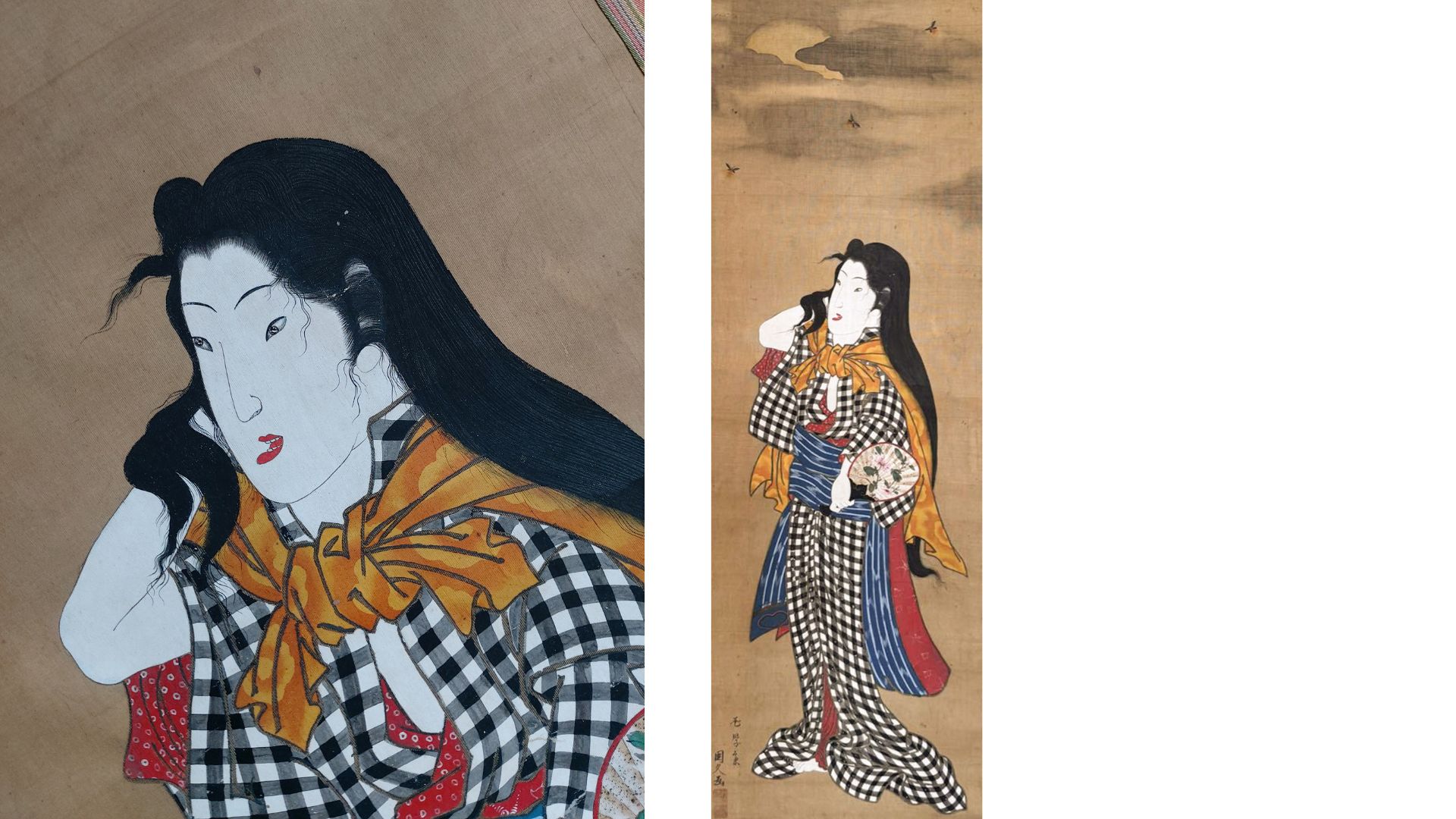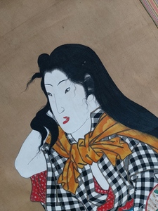 From what I can read, the final part of the signature appears to say Kunihisa (國久). This matches both the last part of the signature, the first seal, and the text on the woman’s obi. However, the style and the likely date of the work don’t seem to align with the life dates or known styles of either Kunihisa I (active 1801-1818) or Kunihisa II (1832-1891).