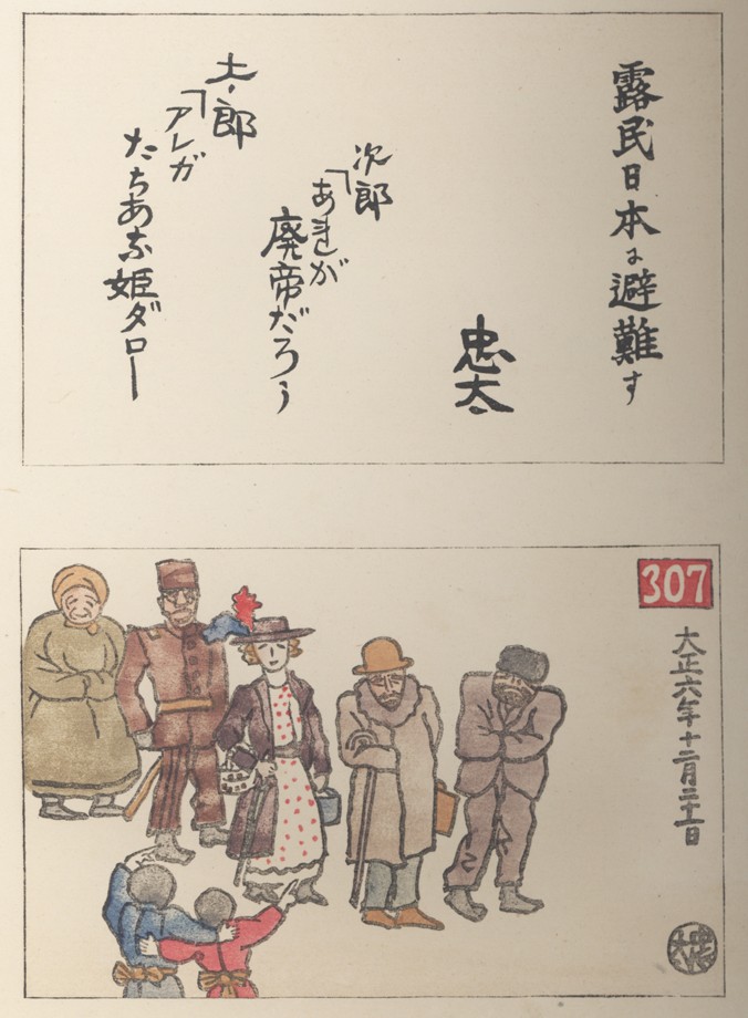 Wondering about the character following あ in the dialogue between the comic characters Jirō and Tarō in the commentary by Itō Chūta on his own sketch Russians Flee to Japan. It seems to make sense that it is き, but I see an additional mark that confuses me. Anyway, confirmation of that first line of dialogue would be appreciated (along with the rest of my below transcription.