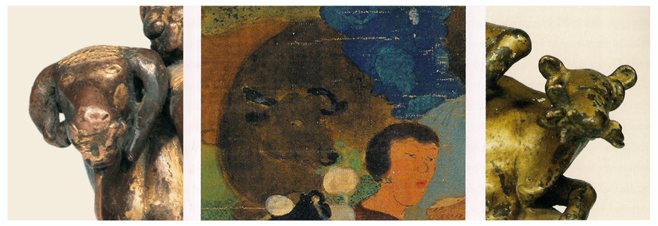 Figure 7: left detail of Fig. 2; center, detail from a painting of Marpa, Choying Dorje collection of Heidi and Ulrich von Schroeder; right, detail of Fig. 4.
