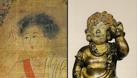 手(Vajrapani)必不可少的持物是金刚杵,而财富之王俱 毗罗(Kubera)的持物是吐宝鼠。主尊头顶有大量卷发,