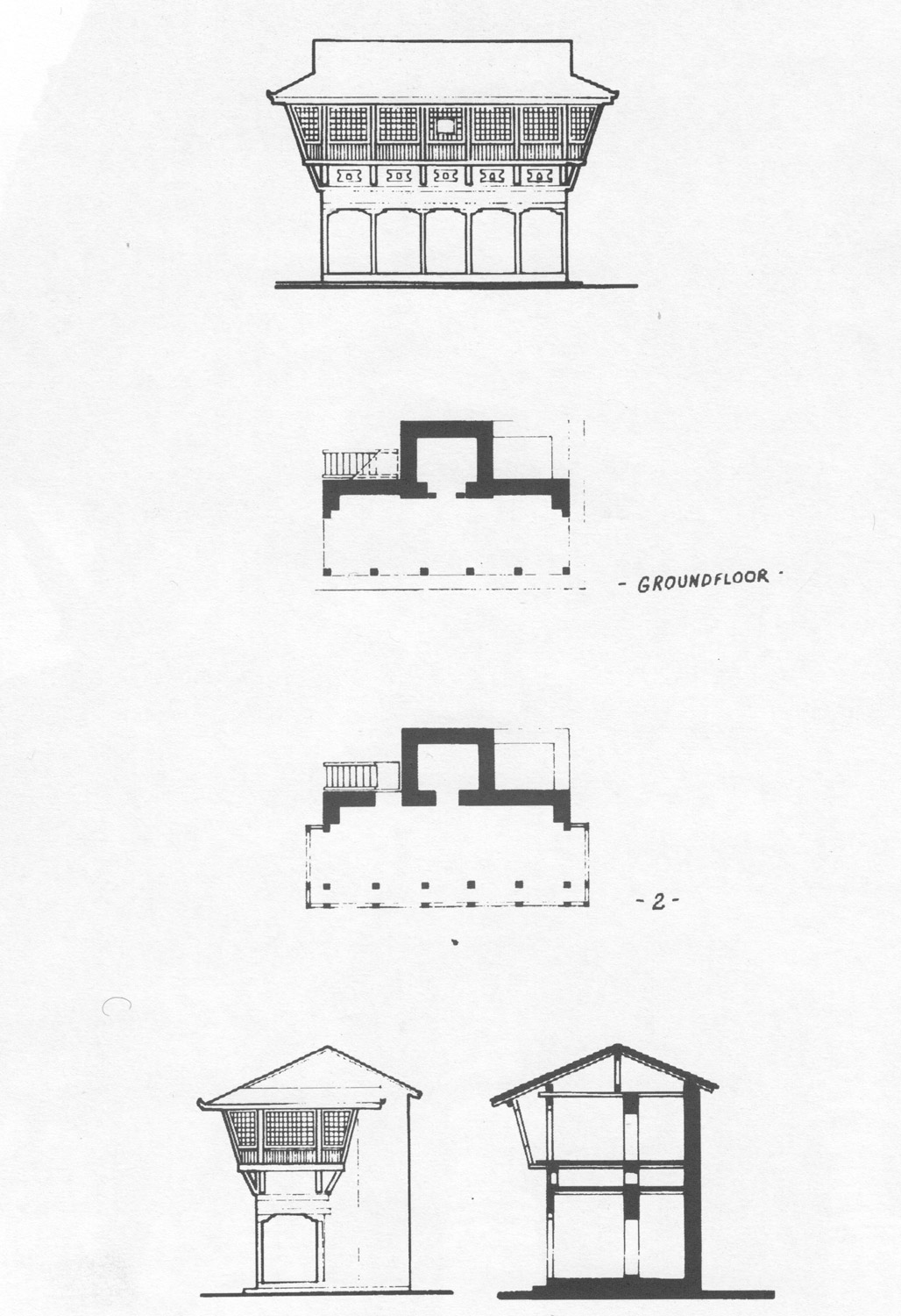 Fig. 15. Sundhārā-sattal elevation, section, and plans. All line drawings made by Mr. Wolfgang Korn. © Mary Slusser 1974.