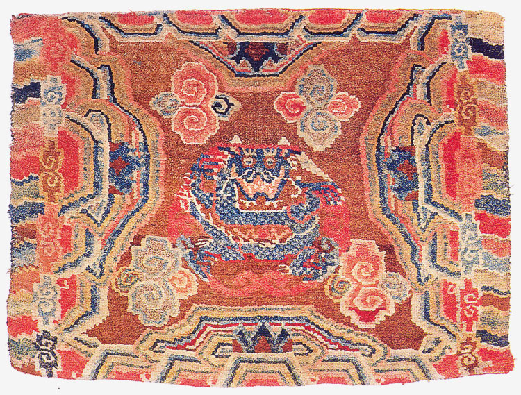 3: Flat-Head Dragon An extremely old piece with a multiplied, thick pile. Tibetan dragon renderings are endless, but with its flat head and big grin this one is unique. Its effect was intended - what seems comic may have been auspicious to Tibetans creating numerous delightful animal forms. |