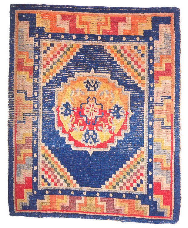 7: Tibetan Coin Medallion At first glance this looks like thousands of other medallion carpets Tibetans picked up from the Khotanese tradition, which were perhaps considered seats of the Buddha (see Bidder, 1964). The use of geometrics and color transforms this into a purely Tibetan conception. The colors are exactly the same on the front and back, even with the hard use of a saddle carpet. The use of color and the checkerboard corners show simplicity and sophistication. |