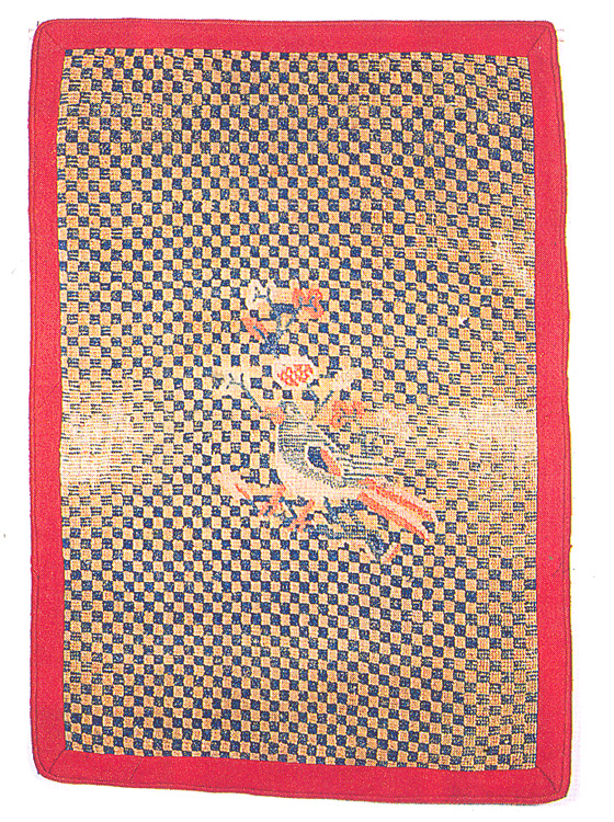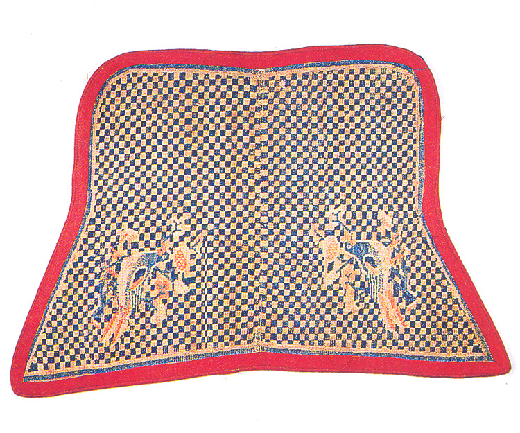 8: Checker Bird Checkerboard designs are found in textiles from many cultures, but Tibetans produced an enormous number of them. They were thought to bring good luck and were often used at marriages. This saddle set with the "bird from far away" is unique among surviving pieces. |