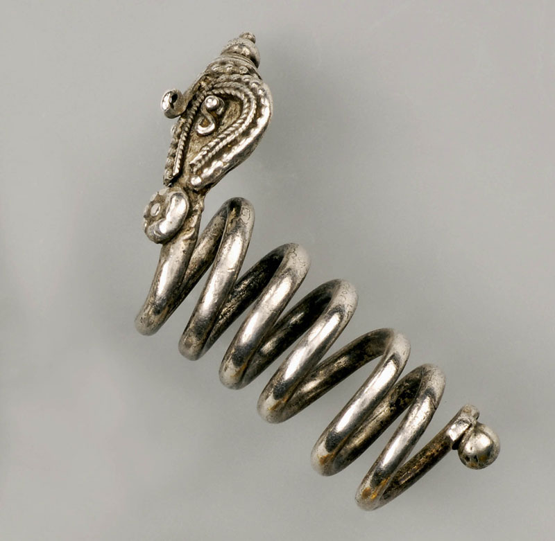 Fig. 19: In this nagulu earring from North Andhra Pradesh, spirals of thick silver wire end in a flat heart-shaped piece indicating the hood of the cobra Silver, 15-20 g