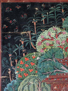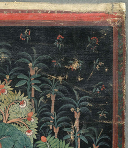The trees in the background here, depicted in greater detail than on the manuscripts miniatures due to the enlarged scale, have been described as Indian and consistent with those in the manuscripts by Susan and John Huntington [