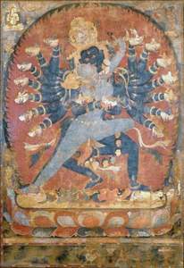 A Panjarnata Mahakala is most likely a rare and beautiful example, in the Sakyapa context, of the integration of this stylistic tradition derived from India. (Fig. 22) Its attribution to the Sakyapa tradition can be based on the subject itself, which is highly revered by this school, and especially on the spiritual lineage of the upper register. Although no figures are identified by inscriptions, the master shown facing forward in the eighth position from the left has certain details, such as white hair, that most often characterize Sachen Kunga Nyingpo (1034-1102), the third Sakya Trizin and considered the first of the five great founding masters of the Sakyapa tradition.