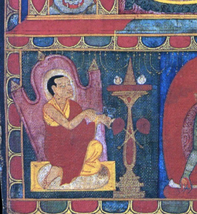 The monk in adoration beneath the goddess's right hand is seated in a relaxed posture, one leg folded beneath his body and the other with the knee raised, also appearing to float in the air. (Fig. 16) It should be noted that this monk's sitting position is similar to that of secondary deities and many representations of lamas on the oldest Indian-inspired Tibetan thangkas. (Fig. 17) The monk's face also echoes the characteristic features appearing on the same archetypes.
