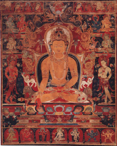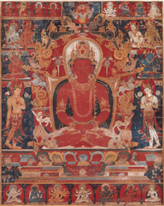 The other three paintings come from a series of five tathagatas that is now scattered, two of which have long been considered among the oldest Nepalese paubhas dating back to the first half of the thirteenth century. (Figs. 24, 25) The discovery of the third in the series, depicting Amoghasiddhi and a line of masters most likely Sakyapa (Fig. 26), confirmed the belief of some that these were in fact paintings executed in Tibet by an exceptional Newar artist.