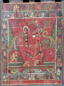 An overall analysis of the composition reveals that the highly talented artist behind this work has superimposed three elements inspired by different sources. As a result, rather than a happy synthesis of Indian and Nepalese elements, it might be better to speak of a juxtaposition or interweaving of these elements, imposed by constraints linked to the commissioner's request or the particular conditions of its creation.