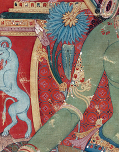 What most impresses any observer on first examination of this thangka is the extraordinary miniaturization of the details that cover it, in which the gaze tends to lose itself in a hypnotic way, making us forget that a painting should logically be looked at with a little distance.