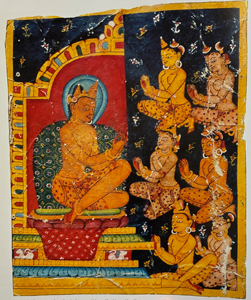 Whether the shrine is legendary or supposed to reproduce a vanished or unidentifiable monument in India, is of no importance in principle. The painter has chosen to magnify it beyond anything pictorially known to date in this typology. To achieve this, he has succeeded in synthesizing elements from the major styles found in Pala manuscript paintings.