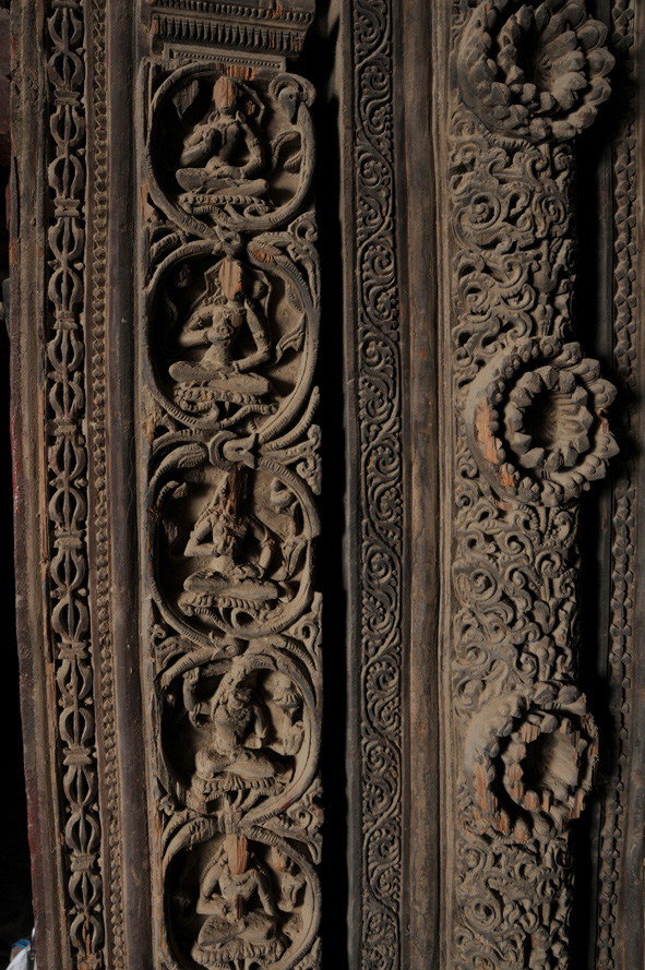 Lhakhang Chenmo, portal, top zone of the right jamb, detail of subordinated deities of the Vajradhātu mandala; the first two medallions depict two of the major goddesses of the main direction in the Vairocana circle: Dharmavajrī and Karmavajrī holding a lotus and crossed vajra.