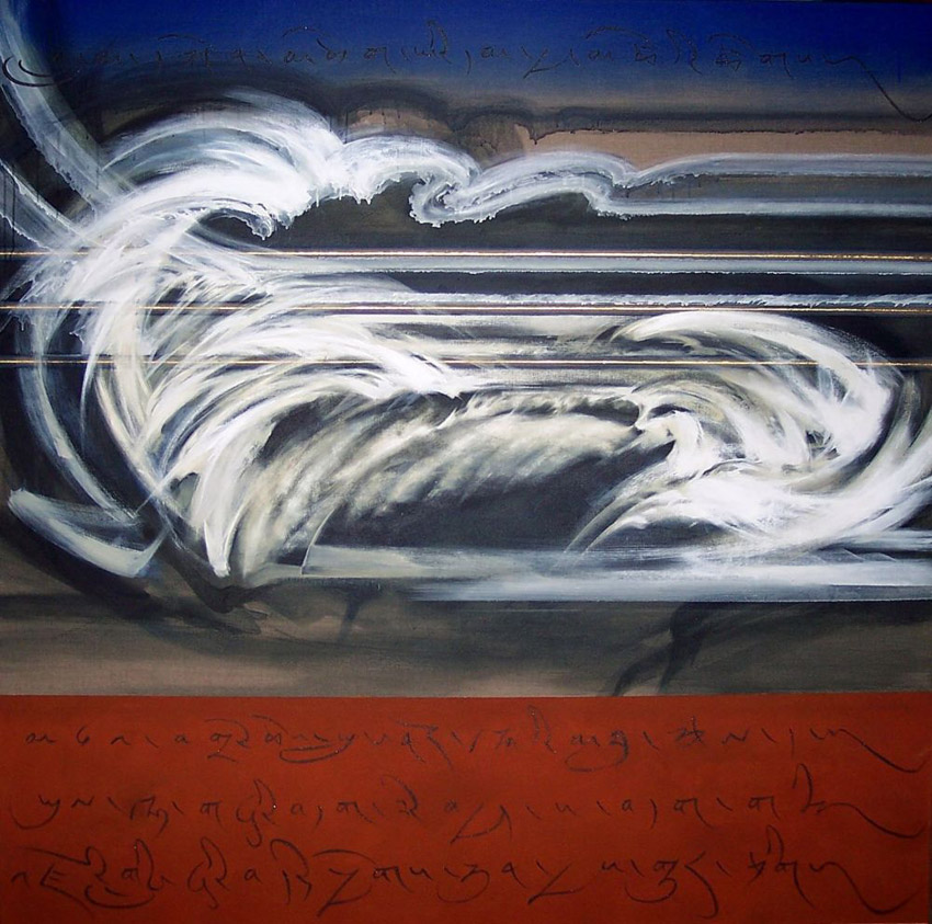 LUNGTA Triptych - MANJUSHRI 2009 Acrylic, clay, gold, and iron on linen Dimensions: 6 x 6 feet © 2009 Maureen Drdak