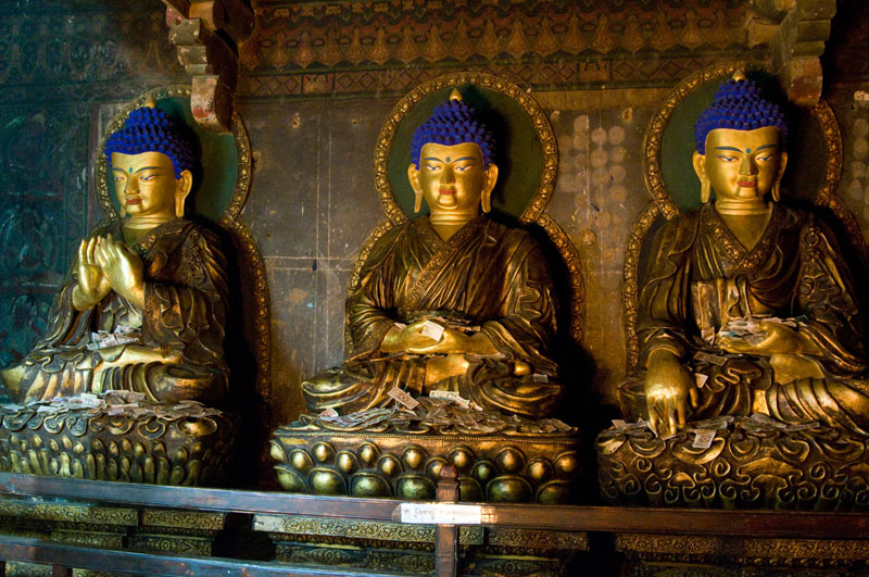 Fig. 7: Seated Buddhas clay statues Yum chen mo lha khang, north wall, Zha lu, 2009.