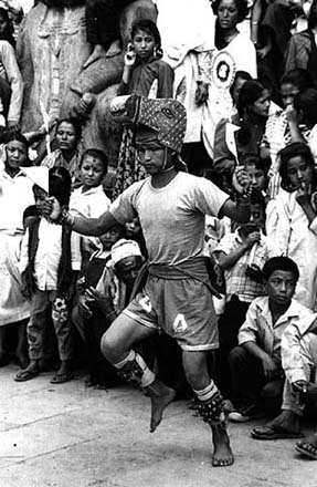 A Bhaktapur boy performing the Horse Dance during the Gai Jatra festival of the dead. During this festival many traditional dances are performed on street crossings and squares, turning the whole city into a stage.