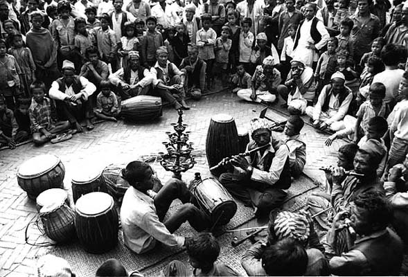 Bhaktapur Newar farmers playing the nine drums (Nawabaja) with the accompaniment of flutes during Pancadan Carhe festival for the five Dipankara Buddhas.