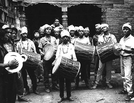 A group of drumming students on the completion of their apprenticeship after performing the final puja for the god of music and dance, Nasadyo.