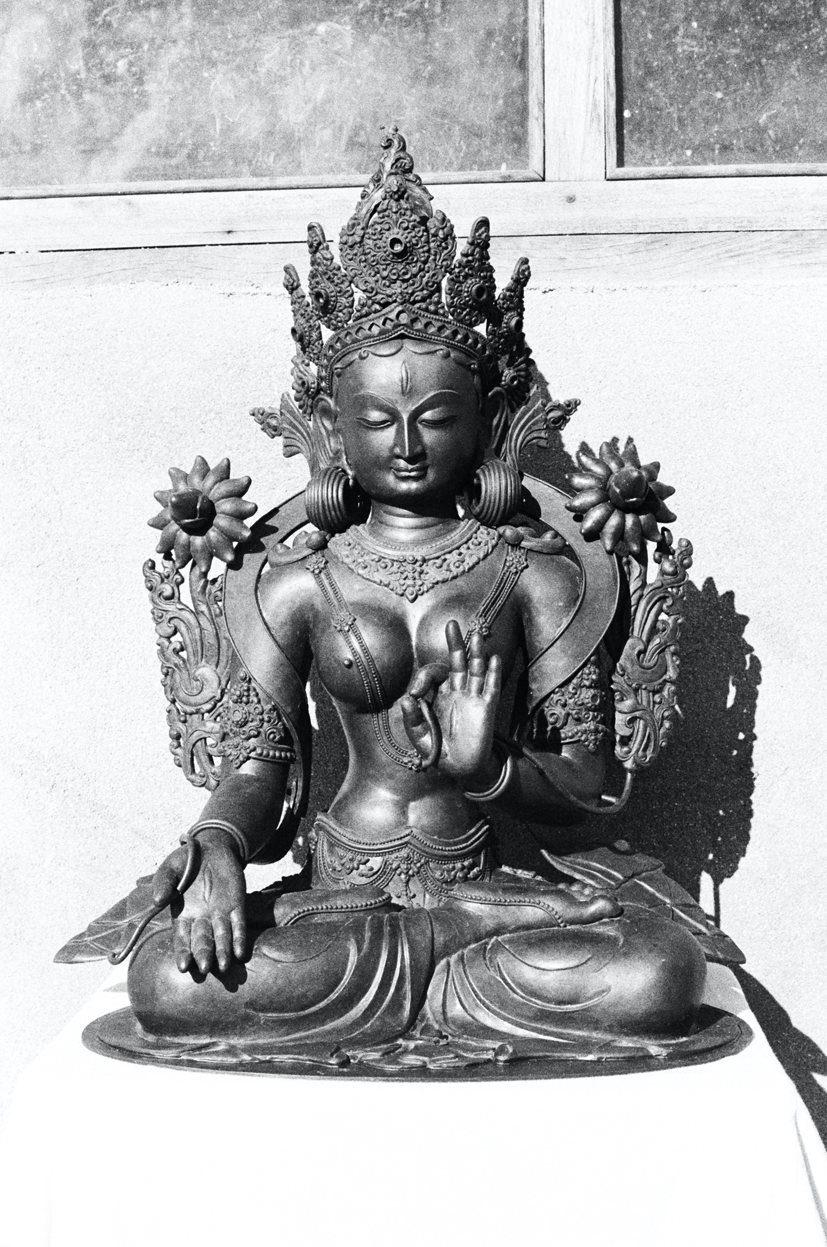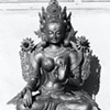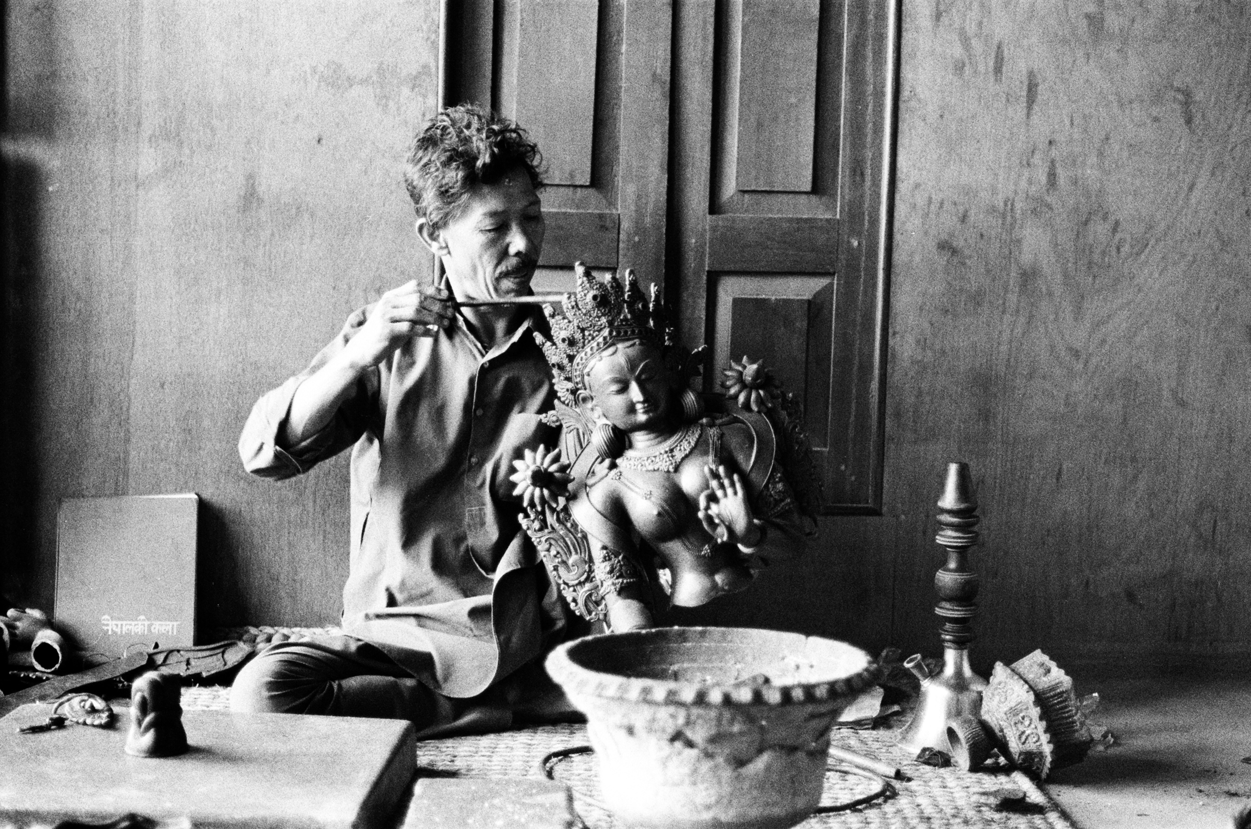 Fig. 3: Bodhi Raj Sakya adds a detail to a magnificent large figure of Tara. The wax figure will later be covered with a mold for casting.. Photo: Ian Alsop, ca. 1973-74.