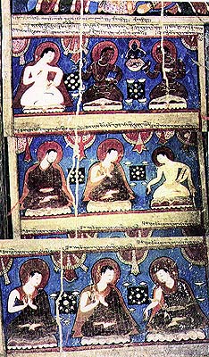 Lineage of monks. Mural, top floor, left of entrance, Three-tiered Temple, Alchi. Phagmodrupa is shown in conversation with Drigungpa at bottom right. Photograph courtesy of Jaroslav Poncar and Roger Goepper. Please note the illustration consists of three small photographs arranged in a collage; the inscriptions are in some casesrepeated.