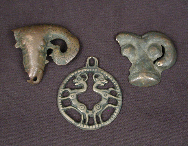 | The two wild sheep head amulets are attributed to the pre-Buddhist period. Both specimens have one horn missing due to breakage. For display, these large, thin cast heads were probably mounted on some type of backing. The two heads are powerfully rendered as if they possess a divine quality. The large round eyes of the specimen on the right reinforce this preternatural aura. Although their general appearance and body position is more reminiscent of goats, the pair of short-horned animals contained in the circlet might also portray wild sheep. The loophole definitely identifies this object as having been made for suspension from the body. This thokcha either dates to the pre-Buddhist or early Buddhist period. |