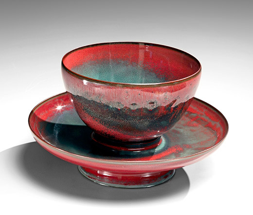 KAWASE SHINOBU (b. 1950). Red, round teabowl and red stand 2015 Glazed porcelaineous stoneware Teabowl: 2 3/4 x 4 5/8 in. Stand: 1 7/8 x 6 7/8 in.