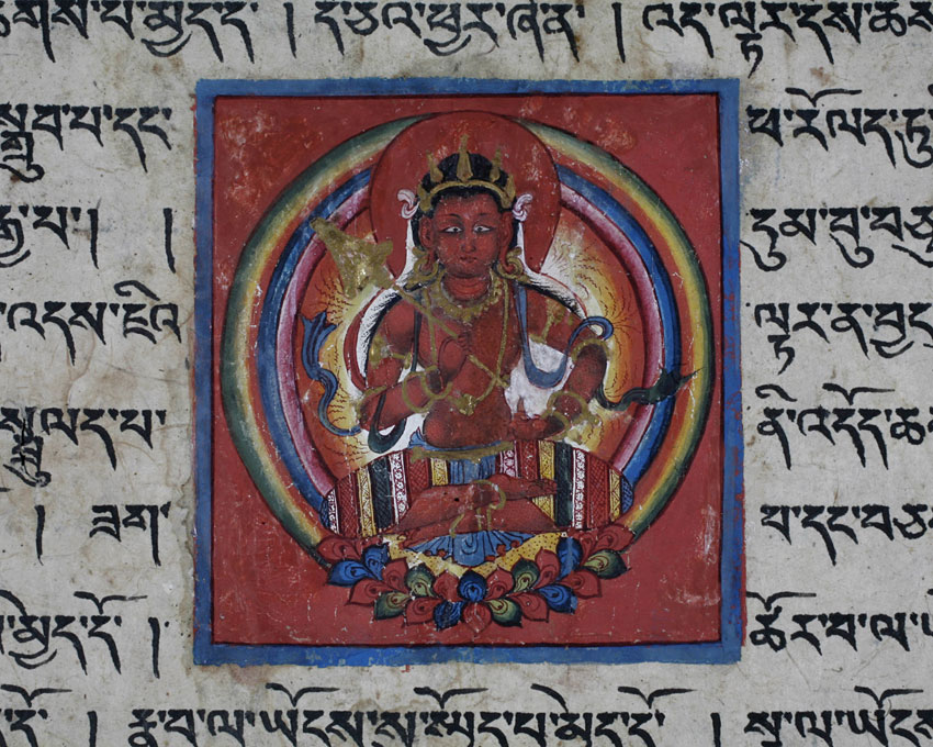Illuminated folio. Bodhisattva, kashmir style Paper, pigment, gold,ink, West Tibet 11th-12th c. cm.68 x 24 Illumination : circa 8,5 x 8