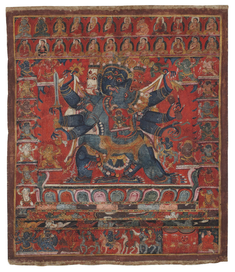 Tangka of Bon deity Lhar god in embrace with his shakti Distemper on cotton West Tibet 14th century cm. 33 x 38