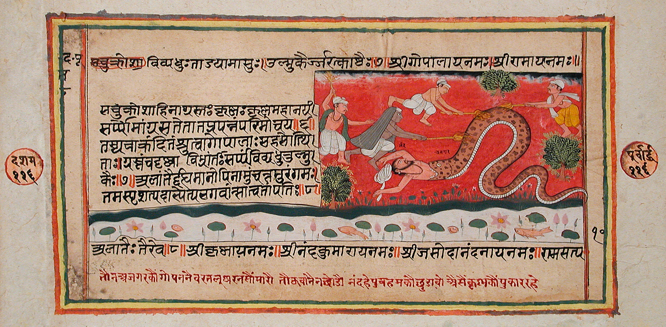 The Python Swallows Nanda (Recto), Singeing of the Python (Verso), Folio from a Bhagavata Purana (Ancient Stories of the Lord)