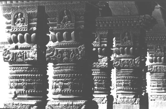 The decorative crafts of Nepal at their artistic peak in the late 17th century (Left Above) Carved Pillars of the courtyard arcade; (Right Above) Details of the gilt repousse sheathing of the Golden Door