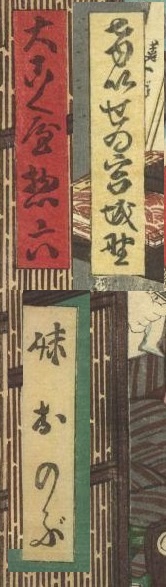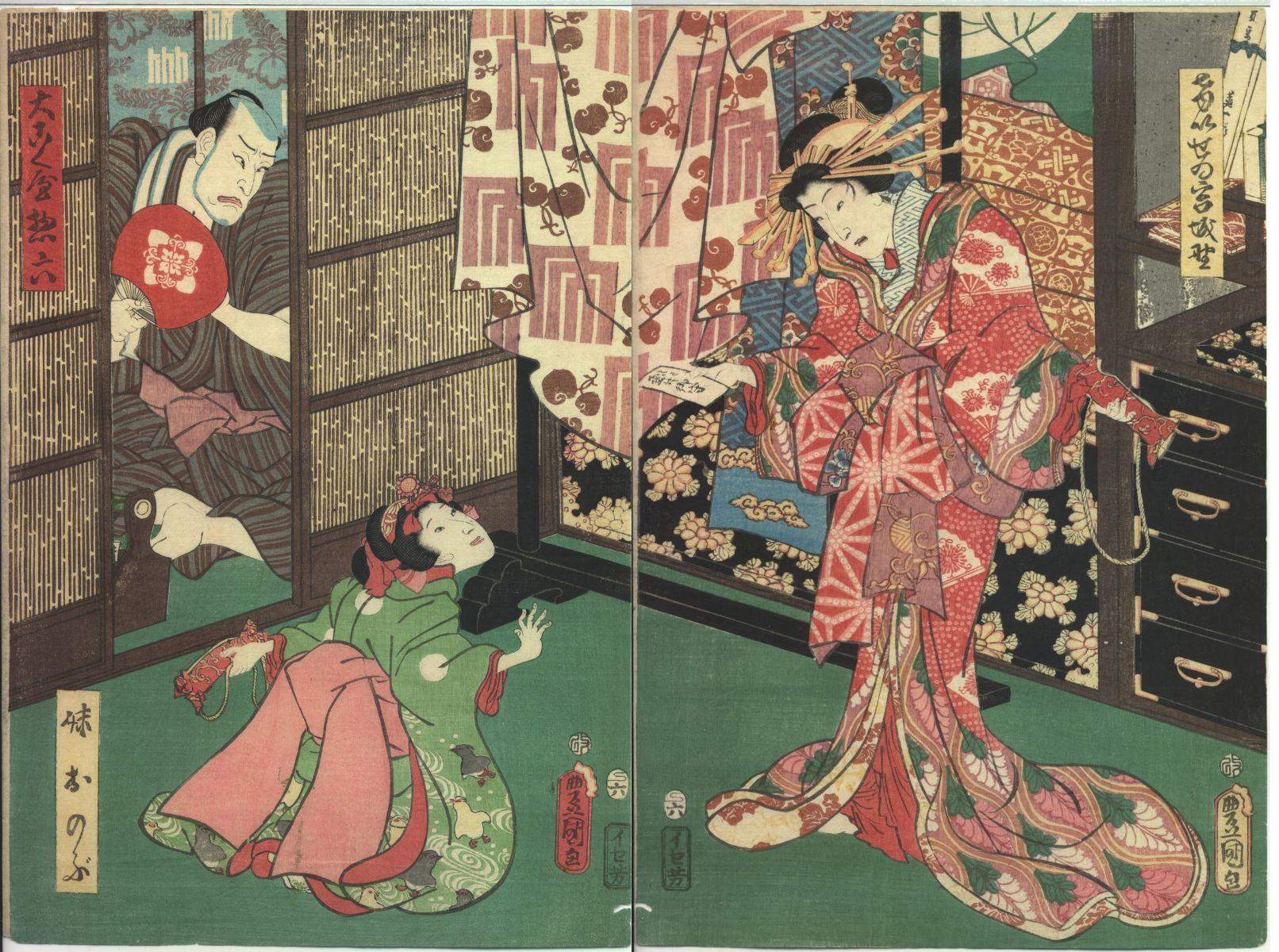 I need a little help with a Japanese woodblock print by Utagawa Kunisada, printed in 1857. I can't find it with an image search. I think it is a genji print because of the symbols on the cloth at the center of the diptych. However, I can't match the symbol to any of the genji-mon in the 3rd picture. (Do some of the chapters of the Genji have an alternative genji-mon?