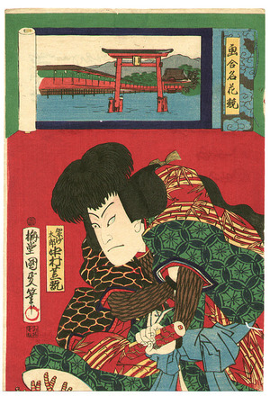 The Itsukushima Shrine on Miyajima Island in Aki Provine is depicted in the upper part of the picture.