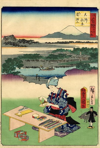 The picture depicts Ōmori straw crafts, a speciality product of the Ōmori area along the Tōkaidō Road (present-day Ōta Ward, Tōkyō). The lady in the picture is weawing objects out of straw against the backdrop of the famous Kawasaki Daishi Ferry.