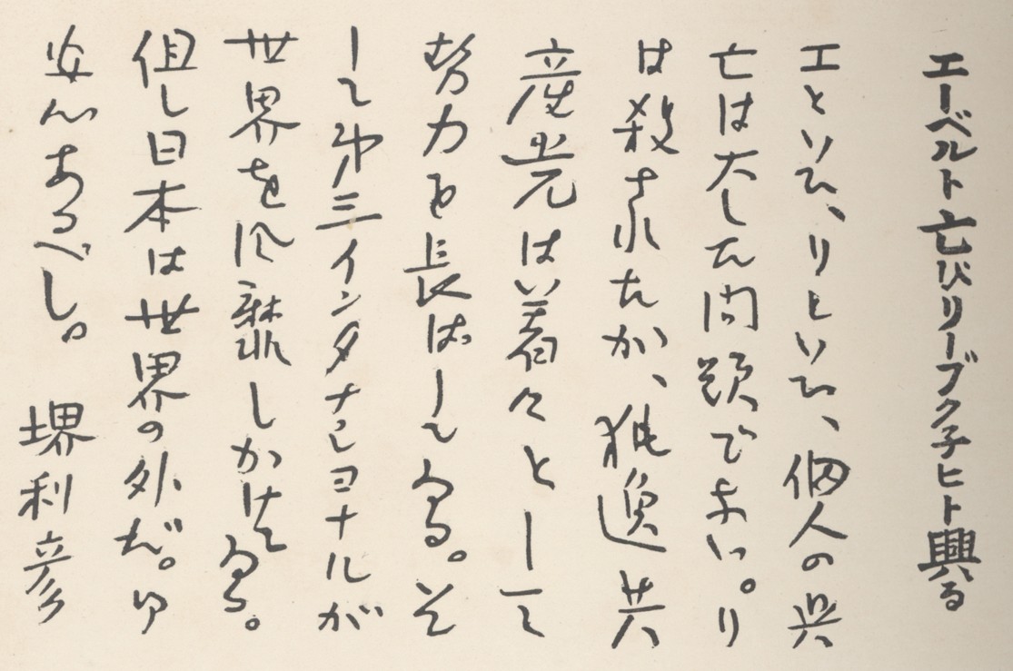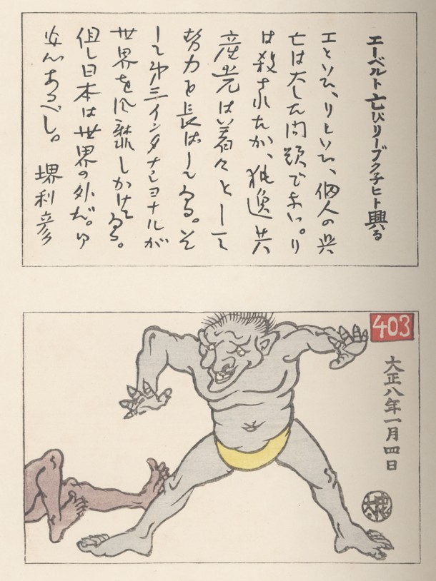 Posted By: Irwin Tue, Mar 24, 2026 IP: 174.127.209.134 With apologies for its length, a transcription of the attached commentary by Sakai Toshihiko 堺利彦 on Itō Chūta's attached sketch titled "Ebert Falls, Liebknecht Rises" (エーベルト亡びリープクネヒト興る) would be very much appreciated. The context of the sketch is the leftist uprisings that broke out in Germany following the WW1 armistice and the possibility of the Social Democratic Chancellor, Frierich Ebert being overthrown by the Spartacist (Bolshevik inspired) Karl Liebknecht in early January 1919. Other than a few phrases such as 世界を征服 (world conquest) and Sakai's sarcastic closing using the expression 安んずるべし "rest assured," my attempted transcription is a mess. |