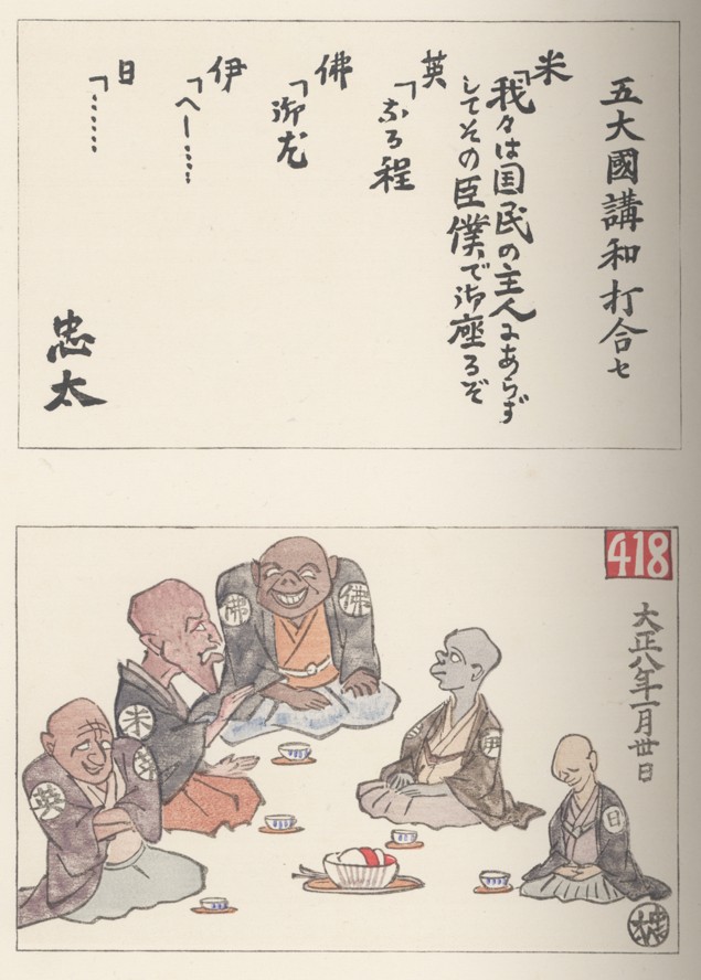 Posted By: Irwin Sun, Mar 29, 2026 IP: 174.127.209.134 Confirmation or corrections to my transcription of Ito Chuta's imagined humorous dialogue between the United States, Britian, France, Italy and Japan appearing above his attached sketch titled 五大國講和打合 (The Five Great Powers Confer on Peace Terms) would be appreciated. |